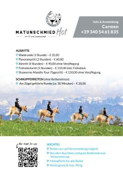 Erlebe unvergessliche Reitmomente am Matunschmied Hof! Ob idyllische Waldrunde, atemberaubender Panoramaritt oder einen Tagesausflug zu den "Stoanerne-Mandln" – bei uns findet jeder Pferdefreund das passende Abenteuer! Auch Anfänger sind herzlich willkommen beim geführten Schnupperreiten. Nur mit Voranmeldung Jetzt buchen bei Carmen: +39 340 54 61 835 Mehr Infos und Standorte per QR-Code!