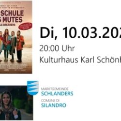 • Der Kinofilm DIE SCHULE DES MUTES - RULE BREAKERSER wird am Dienstag, 10. März 2026 um 20:00 Uhr im Kulturhaus Karl Schönherr gezeigt. Der Chancenbeirat der Marktgemeinde Schlanders lädt in Zusammenarbeit mit dem Kulturhaus Karl Schönherr herzlich ein! USA 2025, 120 Min. Regie: Bill Guttentag Mit: Nikohl Boosheri, Ali Fazal, Noorin Gulamgaus, Amber Afzali Der Film erzählt die Geschichte junger Frauen in Afghanistan, die sich entgegen aller Widerstände ihren Platz in der digitalen Welt erkämpfen. Im Zentrum steht Roya Mahboob, die eine IT-Schule gründet, um Mädchen Zugang zu Bildung, Technologie und einer freien Zukunft zu ermöglichen – in einem Umfeld, in dem Mut zur überlebenswichtigen Ressource wird. Eintritt frei – kleiner Umtrunk mit Snacks im Anschluss.