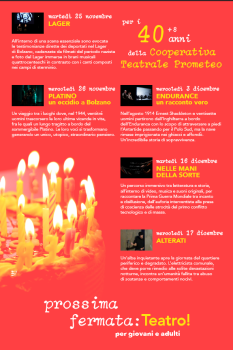 Testo vincitore del 57° Premio Riccione Teatro Dal 2016 il Teatro Stabile di Bolzano organizza Wordbox - Parole per il teatro, una rassegna di produzioni teatrali che porta il pubblico a stretto contatto con una parte della messa in scena solitamente inaccessibile come le prove dello spettacolo nel momento cruciale in cui si affinano personaggi, movimenti e quadri che andranno a comporre la pièce. Wordbox è sia fucina di ricerca testuale, sia un cantiere aperto al pubblico dove nascono e si sviluppano nuovi progetti e vengono svelati i processi creativi che portano alla realizzazione di uno spettacolo. Le parole sono le protagoniste assolute delle rappresentazioni, destinate a un numero ristretto di spettatori a recita. Bolzano, Sala Prove, 05-08 dicembre ore 18:00 LUCIA CAMMINAVA SOLA testi e regia Tolja Djokovic con Tolja Djokovic, Aura Ghezzi