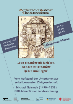 Gesamtprogramm: https://www.meran.academy/14-11-2025-vortrag-und-podiumsdiskussion-vom-aufstand-der-untertanen-zur-selbstbewussten-zivilgesellschaft-michael-gaismair-1490-1532-500-jahre-tiroler-landesordnung/