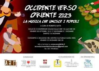 Occidente verso Oriente 2023 prevede un ciclo di cinque conferenze online e un concerto a Bolzano nel Centro Culturale Maria Heim in via Novacella 5, finalizzati a far conoscere le culture e tradizioni musicali di alcune aree del mondo. Verranno prese in considerazione musica dell’India, della Bulgaria, del Brasile, dei paesi arabi ed il Gamelan indonesiano. La musica come metodo per la relazione e la convivenza.
