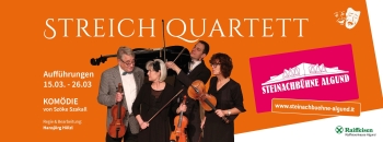 Zum Inhalt: Der geschäftstüchtige Direktor Schwarz und seine hübsche, leider nicht mit hoher Intelligenz gesegnete Gattin Bella erwarten einen wichtigen Geschäftspartner als Gast. Zum vollkommenen Gelingen des Abends sollte ein „betriebseigenes Streichquartett“ mit schöner Musik beitragen, das der Personalchef eigens zusammengestellt hat. Der hohe Gast, der den Betrieb retten soll, setzt sich in den Ohrensessel und wartet gespannt auf den Konzertbeginn. Ob es zum vollendeten Kunstgenuss im Hause Schwarz kommt oder nicht, zeigt die Steinachbühne Algund von 15. bis 26. März im Dachtheater des Thalguterhauses Algund