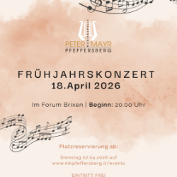 Die Musikkapelle Peter Mayr Pfeffersberg lädt Sie, Ihre Freunde und Angehörigen zum Frühjahrskonzert am Samstag, 18. April 2026 um 20 Uhr im Forum Brixen herzlich ein! Sitzplätze können ab Dienstag, 07. April 2026 20:00 Uhr auf unserer Internetseite https://mkpfeffersberg.it/events/ reserviert werden. Restplätze sind an der Abendkassa verfügbar. Auf Euer kommen freut sich die Musikkapelle Peter Mayr Pfeffersberg