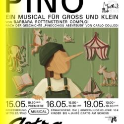 Der Musicalclub Brixen geht in die zweite Runde und freut sich dieses Jahr das Stück Pino zu präsentieren. 18 engagierte Jugendliche haben über das gesamte Schuljahr gesungen, getanzt und geprobt. Erleben Sie die abenteuerliche Geschichte einer Holzpuppe, die von List, Lügen und inneren Ängsten geprägt ist – und doch nur ein guter Mensch werden möchte. Unter der Regie von Barbara Rottensteiner Comploi und der musikalischen Leitung von Marion Palfrader. von Barbara Rotteinsteiner Comploi nach der Geschichte Pinocchios Abenteuer von Carlo Collodi