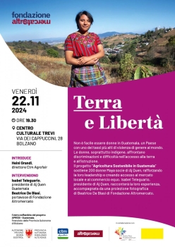 Il progetto “Agricoltura Sostenibile in Guatemala” sostiene 200 donne Maya socie di Aj Quen, rafforzando la loro leadership e creando accesso al mercato locale e al commercio equo. Isabel Teleguario, presidente di Aj Quen, racconterà la loro esperienza, accompagnata da una proiezione fotografica di Beatrice De Blasi di Fondazione Altromercato.