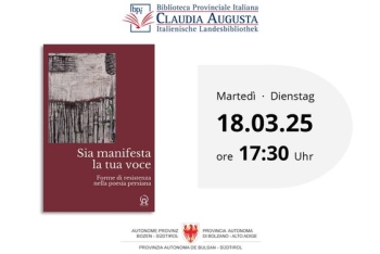 In occasione della Giornata Mondiale della Poesia, la Biblioteca Provinciale Italiana “Claudia Augusta” è lieta di invitarvi alla presentazione del libro “Sia manifesta la tua voce. Forme di resistenza nella poesia persiana”. La curatrice Rossella Renzi, direttrice della collana “Territori” per la casa editrice Argolibri, dialogherà con Roberto Marino, presidente dell’Associazione Lettera 7, Sabri Najafi, presidente dell’Associazione Donne Libere Iraniane, e la professoressa Barbara Gramegna. Letture a cura di Nina Sadeghi, poetessa e traduttrice.