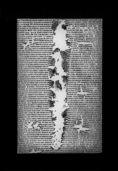 Un video recante una “sezione” dinamica del processo di ri-elaborazione informatica del testo dantesco, alcuni estratti fotografici e un’opera come Metro divino, 2021, che traduce le ricorrenze di tutti i termini impiegati da Dante in una sorta di onda sonora, dialogano con altri filoni di ricerca dell’artista (come le Tele sociali) e con i suoi ultimi esiti su paraffina – The Collapse of the Divine –, in cui il “collasso” del testo dantesco rappresenta in realtà l’apertura di uno spazio infinito di nuove significazioni possibili.