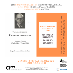 • Presentazione del libro Biografia a cura di Marco Zulberti Un poeta irredento -Taulero Zulberti con Graziano Riccadonna, Luigi Sardi, Marco Zulberti La biografia pubblicata in collaborazione con la Fondazione Museo del Trentino e del Centro Studi Judicaria, cerca di ricostruire la vita di questo poeta, giornalista e scrittore perfetto poliglotta, che nel 1921 giunse a Merano e fondò due riviste di cultura Sudland (in tedesco) e Il Brennero (non il successivo quotidiano che aveva la redazione a Bolzano) che avevano lo scopo di ricucire lo strappo tra le due etnie causata dalla prima guerra mondiale e voluta dai due rispettivi nazionalismi. Sulla rivista attirò collaborazioni importanti sia di lingua tedesca, slava e italiana, tra le quali quelle (più volte vantate ma da verificare) di Kafka in quei tempi ospite a Merano delle Terme. A Merano scrisse nel 1921 il romanzo "L'ipocondria di un Legionario Trentino" dove narrava la storia d'amore tra un ex irredentista trentino e una ragazza di lingua tedesca di Merano. Alla fine del 1923 fu cacciato da Mussolini perchè troppo austriacante e chiusa la redazione. Trasferito a Verona e poi a Bologna divenne corrispondente da Berlino per il Resto del Carlino dal 1930 al 1945 quando lasciò la città in fiamme sotto i bombardamenti. Nel 1950 fu nominato direttore dell'Alto Adige da De Gasperi dove rimase fino al 1955. Scomparve quasi dimenticato nel 1980 a Trento. Autore di diversi romanzi tutti ambientati non solo nella nostra regione ma anche tra Vienna, Praga e Berlino, la sua opera letteraria ancora oggi ci parla di una regione Mittel Europea unita, che sembra ormai divisa e scomparsa. Una ricca biografia che ci parla di qualcosa che è stato dimenticato con molti spunti che possono far riflettere anche gli storici.