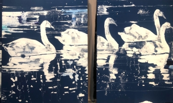 Sulle tele di tessuto dal colore blu profondo, sfilano come in una sequenza filmica, i cigni dal piumaggio bianco candido, richiamandosi l’uno all’altro per poi disegnare insieme una storia dalle variabili infinite.