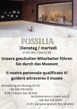 Ogni martedì sera ti invitiamo cordialmente a partecipare a un viaggio affascinante nel passato. Il nostro museo dei fossili a Meltina apre le sue porte per condurti nel mondo dei tesori preistorici.