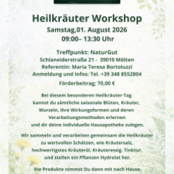 • Heilkräuter Workshop Samstag, 01. August 2026 09:00 – 13:30 Uhr Treffpunkt: NaturGut Schlaneiderstraße 21 – 39010 Mölten Referentin: Maria Teresa Bortoluzzi Anmeldung und Infos: Tel. +39 348 8552804 Förderbeitrag: 70,00 € Bei diesem besonderen Heilkräuter-Tag kannst du sämtliche saisonale Blüten, Kräuter, Wurzeln, ihre Wirkungsformen und deren Verarbeitungsmethoden erlernen und dir deine individuelle Hausapotheke zulegen. Wir sammeln und verarbeiten gemeinsam die Heilkräuter zu wertvollen Schätzen, wie Kräutersalz, hochwertigstes Kräuteröl, Kräuteressig, Tinktur, und stellen ein Pflanzen Hydrolat her. Die Produkte nimmst Du dann mit nach Hause. Kleines, saisonales Mittagessen inbegriffen.