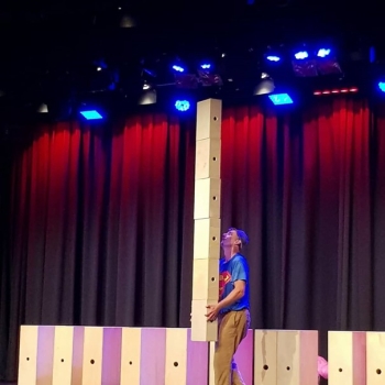 Benny hat einige komische Sachen auf der Bühne herumstehen; Bretter, Kisten, Koffer, Leiter, Bilderrahmen und einen alten Radio.