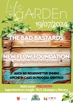 Il 19 luglio 2024 vi aspetta musica dal vivo nel parco del Centro Giovani Jungle! Alle 20.00, la giovane band locale “New Flow Foundation”, dedicata al genere “Flowing Soul Roots’ n Roll”, darà il via all’evento e garantirà un’atmosfera speciale. Dopo di che la cult band meranese “The Bad Bastards”, il cui sound originale “dark folk” non manca mai di affascinare il pubblico.