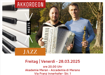 Salvo La Ferrera (1. vincitore Trophée Mondiale, categoria„Jazz“) e sassofonista Ralf Ritscher 90 min Concerto Jazz su annuncio Worldmusic/Tango, Duo Akkordeon/Saxophon Il Duo Due Bellini delizia il suo pubblico con una miscela unica di tradizione e innovazione. Con un approccio musicale raffinato e un profondo estro artistico, i due musicisti esplorano un repertorio che spazia dal jazz alla musica mediterranea, arricchito da improvvisazioni audaci e coinvolgenti. La collaborazione tra i due artisti si basa su un dialogo creativo e intenso in cui fisarmonica e sassofono si intrecciano perfettamente per creare paesaggi sonori intimi e d‘atmosfera. Due Bellini è sinonimo di eleganza tonale e innovazione artistica. La loro musica affascina e ispira portando il pubblico in un viaggio attraverso generi e tradizioni diverse, sempre alla ricerca di nuovi modi di espressione. Che si tratti di serie di concerti o di eventi esclusivi, le loro esibizioni promettono un‘esperienza indimenticabile.