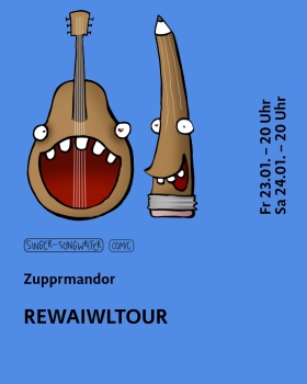 Der Liedermacher Markus „Doggi“ Dorfmann und der Zeichner Jochen Gasser sind wieder da. Als „Die Zupprmandor“ landen sie nach langer Pause vom „Zupprplaneten“ auf der Bühne. Ihre „Rewaiwltour“ bringt einen Mix aus alten Hits und neuen „zupprigen“ Erkenntnissen.