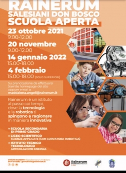 L’Istituto Salesiano Rainerum presenta la sua offerta formativa ai giovani delle scuole primarie e secondarie di primo grado e alle loro famiglie attraverso una mattinata dedicata in cui studenti e professori presentano la scuola, i laboratori e le attività extradidattiche. Le visite avverranno dalle ore 9:00 alle ore 12:00 solo previa prenotazione; l’intera giornata si svolgerà conformemente alle direttive per contrastare l’epidemia Covid-19. Per questo motivo, i partecipanti che desiderano intervenire saranno scaglionati con degli ingressi ogni 15 minuti raggiungendo un massimo 32 visite rispettivamente per la scuola media e per la superiore.