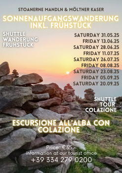 Il sentiero Vi porta alla "Möltner Kaser" fino ai "Stoanernen Mandlen". In questo luogo leggendario, più di cento enigmatiche figure di pietra sono allineate una accanto all'altra. Se fai un'escursione qui, ti sembrerà che il tempo si sia fermato - è così che la natura è incontaminata su questa sorprendente cima alpina a 2.000 metri sul livello del mare. In questo magico luogo di potere sperimenterete l'imponente spettacolo naturale dell'alba.