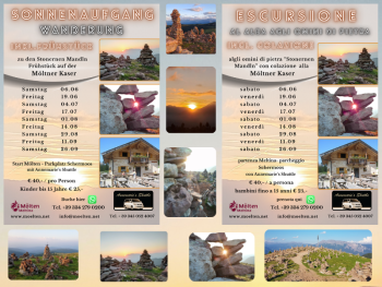 Il sentiero Vi porta alla "Möltner Kaser" fino ai "Stoanernen Mandlen". In questo luogo leggendario, più di cento enigmatiche figure di pietra sono allineate una accanto all'altra. Se fai un'escursione qui, ti sembrerà che il tempo si sia fermato - è così che la natura è incontaminata su questa sorprendente cima alpina a 2.000 metri sul livello del mare. In questo magico luogo di potere sperimenterete l'imponente spettacolo naturale dell'alba.