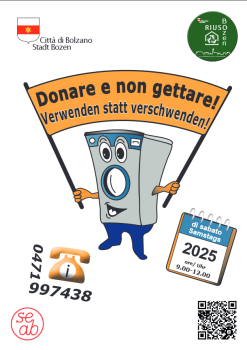 La festa degli ingombranti è il modo più semplice per liberarsi di cose usate ma in buono stato. Durante la manifestazione ognuno può portare o prendere in modo del tutto gratuito gli oggetti che gli interessano. Unica condizione: mobili, elettrodomestici e qualsiasi altro oggetto usato deve essere in buone condizioni e funzionante. Ritiro gratuito: è possibile richiedere il ritiro gratuito di mobili o altri oggetti di grandi dimensioni chiamando il numero 0471-997438 oppure il numero 3481561706. Il ritiro sarà effettuato il giorno precedente alla festa degli ingombranti.