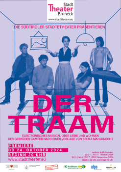 Unter der Leitung des musikalischen Multitalents Simon Gamper wird die Supergroup Südtiroler Schauspieler:innen und die Zither-Meisterin Reinhilde Gamper das Publikum in ihren Bann ziehen. „Der Traam“ ist ein humorvoll-dialektaler Klagegesang über Wohnungs- und andere Nöte. Der Abend verspricht alles, was ein Musical zu bieten hat: große Gefühle, Tanznummern und natürlich jede Menge mitreißende Musik!