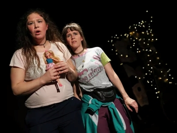 Barbara Maria Angermaier und Marika Rainer singen, rappen und verwandeln Puppen in grantige Dorfbewohner:innen. Die Musik reicht von Volkslied bis Oper – schräg, witzig, live.