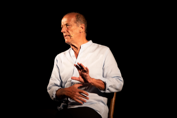 Un uomo da solo seduto su una sedia parla attraverso un microfono ad archetto. Ha una camicia bianca con un collo alla coreana. L'uomo ha circa 70 anni ed ha i capelli rasati ed è un po' stempiato.
