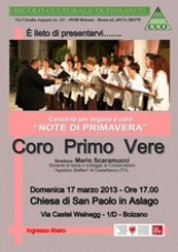 Il “Coro Primo Vere” di Roraipiccolo di Porcia (Pordenone) è un coro a voci pari femminili. Nel corso di questi trent’anni di attività, il coro ha realizzato diversi scambi culturali con gruppi provenienti dall’Italia e dall’estero oltre a collaborare con diverse realtà della provincia di Pordenone per alcune importanti realizzazioni come l’esecuzione dell’Oratorio “St. Nicholas” di Britten sotto la direzione del M° Heltay. Il Coro si è già brillantemente esibito a Bolzano invitato alla Rassegna Musicale 2010 organizzata dalla Corale S. Giuseppe ai Piani di Bolzano. Attualmente il coro è composto di 20 coriste ed è diretto dal 1998 dal M° Mario Scaramucci e, per i brani con accompagnamento pianistico, si avvale della collaborazione del M° Dewis Antonel.