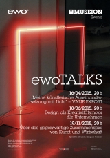 Terzo e ultimo ewoTALK in calendario per il 2015. L’incontro verte sulle possibilità di collaborazione tra il mondo dell’arte e quello dell’economia. Ne discutono Matthias Mühling, Clemens Weisshaar (Kram/Weisshaar) e Hannes Wohlgemuth (ewo).