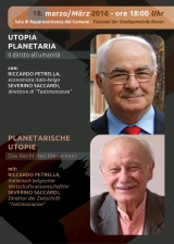 Il 18 marzo si parlerà di "Utopia planertaria. Il diritto all'umanità" con l'economista italo-belga Riccardo Petrella (docente emerito all'università di Lovanio) e con il direttore della rivista fiorentina Testimonianze fondata da padre Ernesto Balducci, Severino Saccardi.