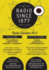 Radio Tandem 98.400 nasce nel 1977 e da 39 anni trasmettiamo, organizziamo, invitiamo, resistiamo! Porta la tua musica e partecipa alla nostra diretta! Sabato 11.06 dalle 14 alle 19.30 in via Talvera 1, Bolzan