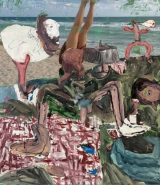 L’esposizione presenta un ciclo inedito di dipinti su tela di grande formato in dialogo con una serie di stampe in formato poster, installate sulla parete di fronte.