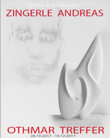 Eros, sensuale, la passione che gode la vita, e Thanatos, la morte, l’annientamento che distrugge la vita: due temi contrapposti, scultura e pittura, due artisti: Othmar Treffer e Andreas Zingerle. Entrambi gli artisti lavorano in modo minuzioso, Othmar Treffer al confine con l‘astrazione, Andreas Zingerle al confine con la mimesi. Treffer si avvicina lentamente, dopo un primo taglio deciso, alla forma che lo soddisfa e la lucida a specchio fino a farle raggiungere un’elevata presenza con una grafica affilata. Zingerle elabora al computer le foto di attentatori scaricate da Internet, ne ritaglia delle sagome e crea, dopo averle più volte spruzzate e ridipinte, delle immagini al limite della sparizione. I contorni sono sfocati, i contrasti deboli. Mentre Treffer, nonostante i diversi formati, porta alla quiete Eros nella pietra levigata, in Zingerle la quiete, nonostante le stesse dimensioni delle immagini, é solo apparente perché il più delle volte gli attentatori non si riconoscono esattamente. Le vittime, che Zingerle aveva dipinto prima di questa serie, erano ancora chiaramente identificabili. Nella mostra l’erotismo e l’annientamento non s’incontrano, né nei materiali, né nelle forme, né nella grammatica della presentazione, anche se l’erotismo comporta sempre qualcosa di distruttivo e la morte qualcosa di sessuale.
