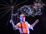 Presenta uno spettacolo comico e magico, un viaggio onirico e visuale accompagnato dalla magia delle piccole cose e da spettacolari effetti con acqua e sapone. L’artista ha già portato il suo irresistibile show in venti paesi su quattro continenti ed emoziona nei teatri, in occasione di serate di gala, in TV, nei festival di strada grandi e piccoli.