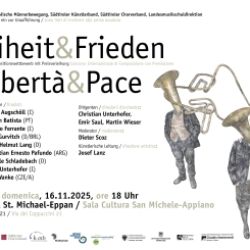 Musica coinvolgente e voci potenti per un mondo più pacifico: domenica 16 novembre 2025, alle ore 18, nella sala culturale di San Michele-Appiano si terrà una serata concertistica straordinaria. In prima esecuzione assoluta verranno presentate nove opere selezionate da tutto il mondo: potenti, commoventi e di alta qualità artistica. Il concorso di composizione internazionale „Libertà & pace“ è il risultato di una collaborazione unica in Alto Adige, nata dal desiderio di intendere la musica non solo come forma d’arte, ma anche come espressione di responsabilità sociale. Il concorso è stato promosso dalla Katholische Männerbewegung, dal Südtiroler Künstlerbund, dalla Federazione cori del Sudtirolo e dalla Landesdirektion der deutschen und ladinischen Musikschulen. Ciò che unisce le organizzazioni è la fede nel potere della musica come espressione di responsabilità e come medium di speranza. La direzione artistica è affidata a Josef Lanz. Dirigono Christian Unterhofer, Emir Saul e Martin Wieser; Dieter Scoz è il moderatore e Otwin Nothdurfter leggerà testi appositamente scritti per questo evento.