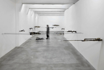 Anche le sculture di Giulia Cenci (1988 Cortona, vive in Amsterdam) creano un rapporto con il luogo che ospita la mostra, sviluppandosi al suo interno e creando una sorta di paesaggio dimenticato. Fome e strutture di derivazione sia organica sia industriale – come ad esempio cavi, pezzi di plastica e metallo o legno– sono raggruppati e dispersi nello spazio, innescando innumerevoli possibili associazioni ma senza mai lasciarsi intrappolare in una singola definizione. Questi lavori danno l’impressione di una disposizione provvisoria, mutevole, in costante mutamento, in cui il visitatore si muove adattando e cambiando costantemente a sua volta il proprio approccio. Giulia Cenci sviluppa infatti i suoi lavori adattandoli sempre allo spazio in cui si collocano, creando in ogni occasione espositiva nuove sequenze e nuove narrazioni.