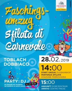 Giovedì Grasso si terrà a Dobbiacola tradizionale grande sfilata di Carnevale. Diverse associazioni di Dobbiaco tra cui la banda musicale, gli artigiani, i commercianti, ma anche gruppi di bambini si ritroveranno assieme per inscenare il Carnevale! I temi proposti e sui quali ridere saranno quelli di attualità nel paese e quelli della politica nostrana e non. Sui temi nel dettaglio non possiamo anticiparvi nulla ma vi assicuriamo che non saranno certamente meno divertenti di quelli di due anni fa. La sfilata partirà dalla stazione ferroviaria di Dobbiaco, attraverserà tutto il paese fino alla Piazza del Municipio dove l’arrivo è previsto verso le ore 15.00. Una apposita giuria di Carnevale premierà il carro più originale. Successivamente ci ritroveremo tutti nel grande tendone per festeggiare il Carnevale con “DJ Zufällig”. La sera, poi, sono tutti invitati a partecipare al Ballo di Carnevale dei vigili del fuoco di San Silvestro presso la Sala Congressi di San Silvestro che avrà inizio alle ore 21.00. L’intrattenimento musicale per la sfilata è affidato alla banda musicale di Dobbiacoe alla “Wurzelkapelle” della Valle San Silvestro. Vi invitiamo a mischiarvi mascherati tra la folla e vi auguriamo buon divertimento. Attenzione: buonumore e simpatia sono richiesti a tutti i partecipanti!