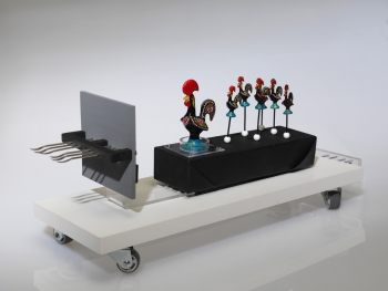 Nel corso degli anni l’artista ha costruito un vero e proprio dizionario materiale e grafico, tale da far invidia ai surrealisti storici creatori di cataloghi di oggetti impossibili: rielaboratore originale di tradizioni precedenti, attribuisce a questi oggetti-mondo un particolare significato simbolico che noi dobbiamo decifrare. Nascono così nuove realtà. Sono metafore, il suo è uno stare in mezzo alle cose, a una situazione che nella storia non ha alcun senso ma che lui riempie di significato dandole una dimensione reale e portando così la metafora stessa fino agli esiti più radicali. Borgesianamente, patafisicamente.