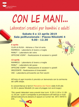 *Per questi laboratori sono previsti due turni: 9.30-11.00 e 11.00-12.30 per i quali è consigliata la prenotazione all'indirizzo e-mail: oltrisarco@comune.bolzano.it oppure ai numeri tel. 0471 997071-070.