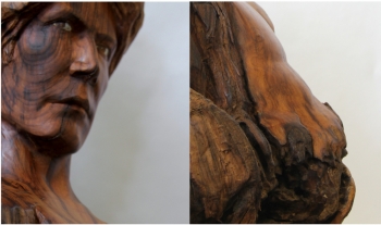 Le sculture figurative in legno sono il vero e proprio cuore della mostra. Figure amorfe da cui fuoriescono gli individui. Nella maggior parte dei casi è solo la testa, o altre parti del corpo, ad emergere dalla “massa originale”. Immagini istantanee. Nei volti si riflette lo stato d’animo interiore. È uno sguardo al mondo dell’anima: ordito, lacerato, crudele e bellissimo.