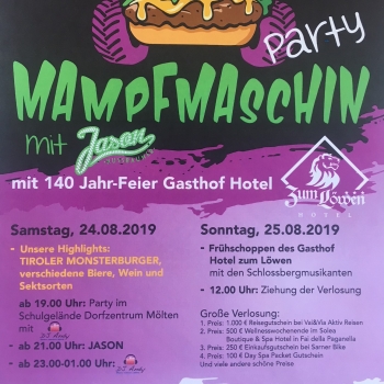 L'albergo Zum Löwen invita tutti a festeggiare il suo 140° anniversario. Il sabato DJ Andy e Jason Nussbaumer offriranno intrattenimento. Ci sono "Monsterburger" tirolesi, ma anche birre, vini e spumanti da gustare. La domenica, il Gasthof organizza una bevuta matutina con esibizione musicale del gruppo "Schlossbergmusikanten" seguita da un'estrazione a premi.