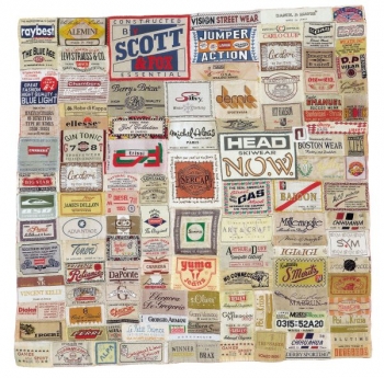 Etichette di vestiti, di magliette, giacche e altri indumenti cucite insieme su cotone compongono, come vivaci patchwork, le opere di Berty Skuber. L’artista altoatesina colleziona etichette dal 1995. Per Skuber l’etichetta è una sorta di opera in miniatura, nascosta all’interno di qualcosa di chiaramente visibile, l’abito.