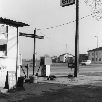 Cesare Ballardini ha scattato queste fotografie in località a pochi chilometri di distanza l’una dall’altra, cittadine e paesi come Lugo, Fusignano, Bagnacavallo, Faenza, Alfonsine. Fin dai nomi, questi luoghi appaiono modesti, semplici, quotidiani. E gli spazi privi di presenze umane delle fotografie sono altrettanto anonimi: semplici case cubiche, un terrapieno erboso, un cartello stradale consunto, depositi di materiali edili, campi arati, canneti, stazioni di servizio, piccole fabbriche, vecchie auto, deserte strade extraurbane; durante il giorno, al tramonto, di notte…