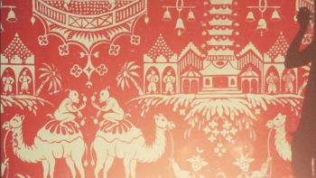 Verticale (sospeso): uno sfondo fatto di lunghi teli di cotone stampati con disegni esotici interroga e disfa le narrazioni della prima industria tessile. Disegnati e prodotti in una fabbrica nella valle del canton Glarona, in Svizzera, e quindi esportati in Indonesia dal porto di Ancona, motivi floreali, scimmie che cavalcano dromedari e palme in colori sgargianti testimoniano una forma particolare di colonialismo felpato. In quella stessa fabbrica ha avuto luogo, nel 1837, il primo sciopero operaio svizzero «capeggiato da donne e bambini» in risposta all’installazione della campana che segnava l’inizio della giornata lavorativa (A Fabric in Turkey Red, 2013/2019).