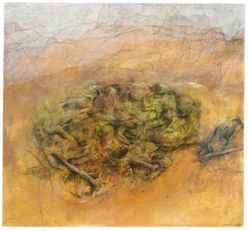 erotica, gli strati sottostanti paiono paesaggi interiori, delicati e indistinti. Il corpo si rende autonomo, non è più palpabile e si dissolve. Le montagne, le rocce, gli scogli e i boschi vengono avvicinati al fruitore in un gesto astratto di matrice sia disegnativa che pittorica. Composti con colori smorzati e immersi in un’atmosfera