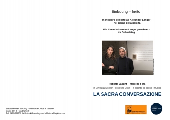 La poetessa Roberta Dapunt ed il violinista e compositore Marcello Fera, il 22 febbraio alle ore 17, sono ospiti nella Biblioteca Civica di Vipiteno con il loro programma “La sacra conversazione”. In questa serata i due artisti si incontrano nelle loro poesie e composizioni, che intrecciano abilmente e dalle quali emergono chiaramente l’osservazione artistica del lavoro e della recita dell’altro ed il forte legame d’amicizia che vi è tra di loro. La manifestazione si terrà nel giorno della nascita di Alexander Langer, al quale la scrittrice nata a Badia ed il musicista residente a Merano dedicano la serata. La manifestazione è organizzata in collaborazione con la Fondazione Alexander Langer