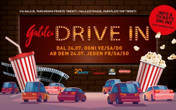 L’estate 2020 avrà il suo DRIVE-IN! Sbarca a Bolzano in via Galilei nel parcheggio fronte Twenty il “Galilei Drive-in” per rivivere l’emozione del cinema in auto! Un’esperienza che richiama un intrattenimento “old style”, riproposto in chiave attuale che ci terrà compagnia fino a fine estate, con un occhio sempre rivolto alle norme di sicurezza che il periodo attuale ci impone.