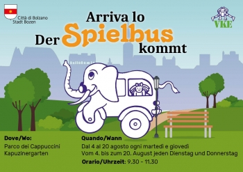 Dal 4 al 20 agosto ogni martedì e giovedì dalle ore 9.30 alle ore 11.30 lo Spielbus del VKE porterà giochi e divertimento al Parco dei Cappuccini.