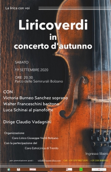 Aderendo con entusiasmo alla manifestazione, il Coro Lirico G. Verdi Bolzano, si propone in una selezione di brani operistici e popolari italiani del ‘800 e ‘900, con la partecipazione dei solisti Victoria Burneo Sanchez, soprano e Walter Franceschini, baritono diretti dal Maestro Claudio Vadagnini accompagnati al pianoforte dal Prof. Luca Schinai vi caleremo nelle poesia del canto Lirico in tutte le sue sfaccettature e colori armonici dei Maestri compositori quali Verdi, Rossini, Puccini ecc. Buon ascolto.