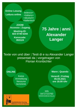 Am 22. Februar 2021 wäre der in Sterzing geborene Alexander Langer 75 Jahre alt geworden. Aus diesem Anlass findet am Freitag, den 5. März, um 18 Uhr eine Online-Lesung mit Florian Kronbichler in Zusammenarbeit mit der Stadtbibliothek Sterzing statt. Florian Kronbichler, Verfasser der Biografie „Was gut war – Ein Alexander-Langer-ABC“, liest Texte von und über Langer in deutscher und italienischer Sprache vor, um an den Menschen Langer, an seine Wurzeln, an seine Arbeit und an das, was geblieben ist, zu erinnern. Kronbichler blickt in seiner Textauswahl nicht nur zurück, sondern vergegenwärtigt ebenso die Aktualität Langers.