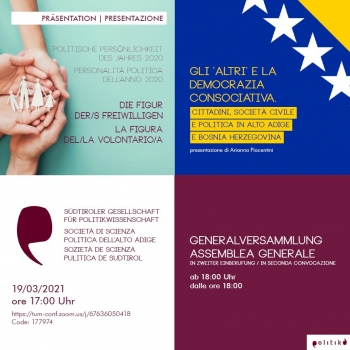 Si terrà poi una relazione di Arianna Piacentini su “Gli 'Altri' e la democrazia consociativa. Cittadini, società civile e politica in Alto Adige e Bosnia Erzegovina”, a cui seguirà l’Assemblea Generale dell’associazione.